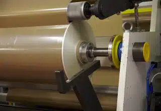 Nous partons d’une bobine mère, appelée aussi jumbo. Cette bobine est composée d’un support d’enroulement, le mandrin, et d’un ruban adhésif. Le jumbo est ensuite introduit dans la zone d’alimentation de notre machine.