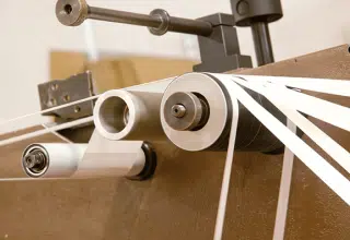 L'atelier de trancannage fonctionne de la même manière qu’une bobine de fil à coudre. L’opérateur ou l’opératrice insère un rouleau adhésif. Celui-ci est ensuite déroulé et enroulé en se décalant à chaque spirale.